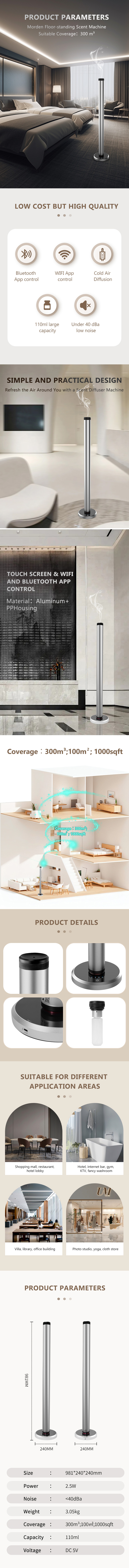 Specification Product Size: Φ180 * 905.7mm Package Size: 981 * 240 * 240mm Power: Bluetooth 2W / 4G 2.5W Noise Level: <40dBa Weight: 3.05kg Net Weight: 1.9kg Suitable Coverage: 300 m³ ;100 m² ;1000sqft Oil Consumption: 1.6ml/h±5% Color: Silver/Black Voltage: DC 5V Installation: Free Standing Bottle Capacity: 110ml PET Bottle Material Design: Aluminum+PP Housing Control: Touch Screen+Bluetooth/ WIFI+Bluetooth